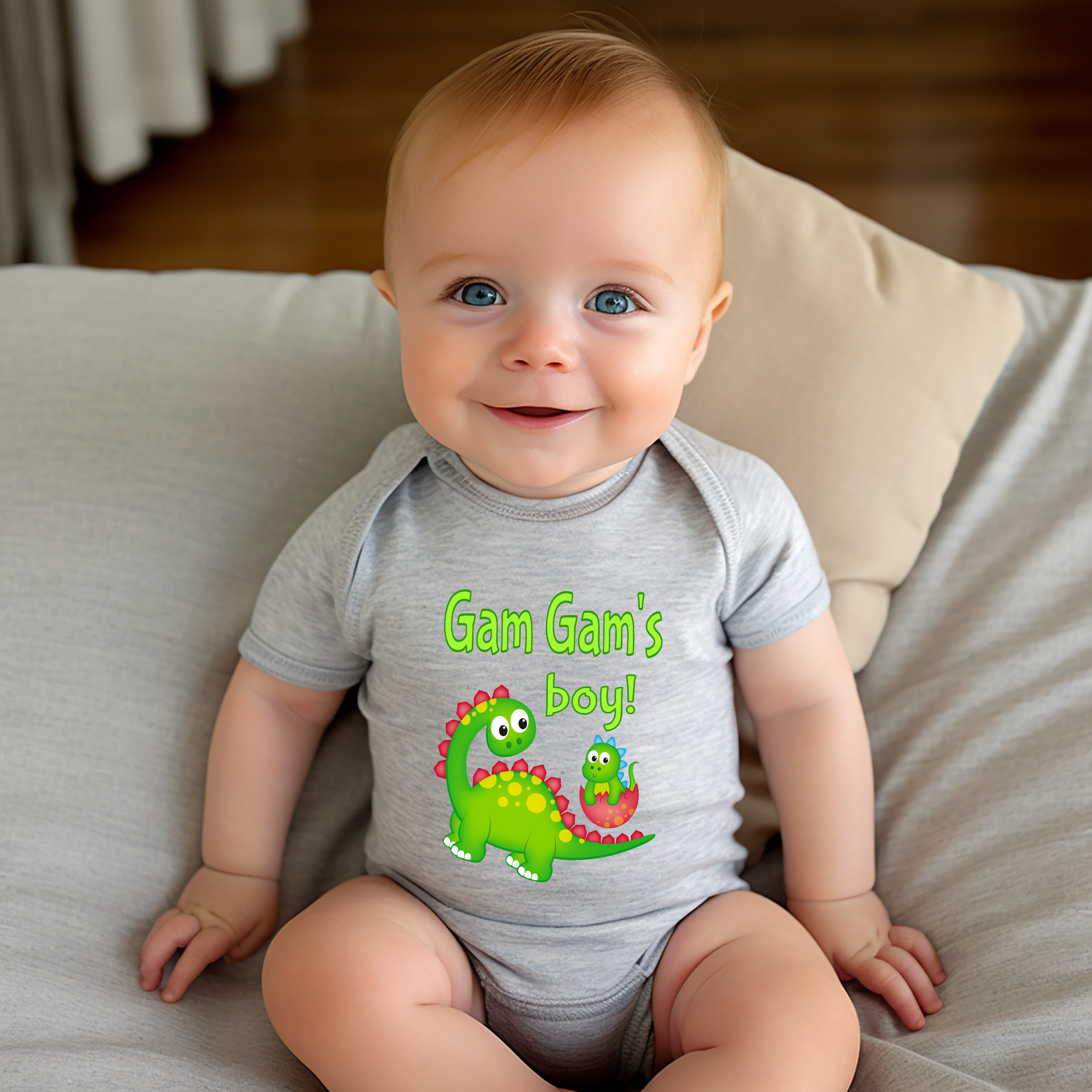 Gam Gam's Boy Cute Grandma Name Dinosaur Baby Bodysuit, Tshirt or Toddler Shirt for a Special Grandmother Gift or Pregnancy Reveal Announcement