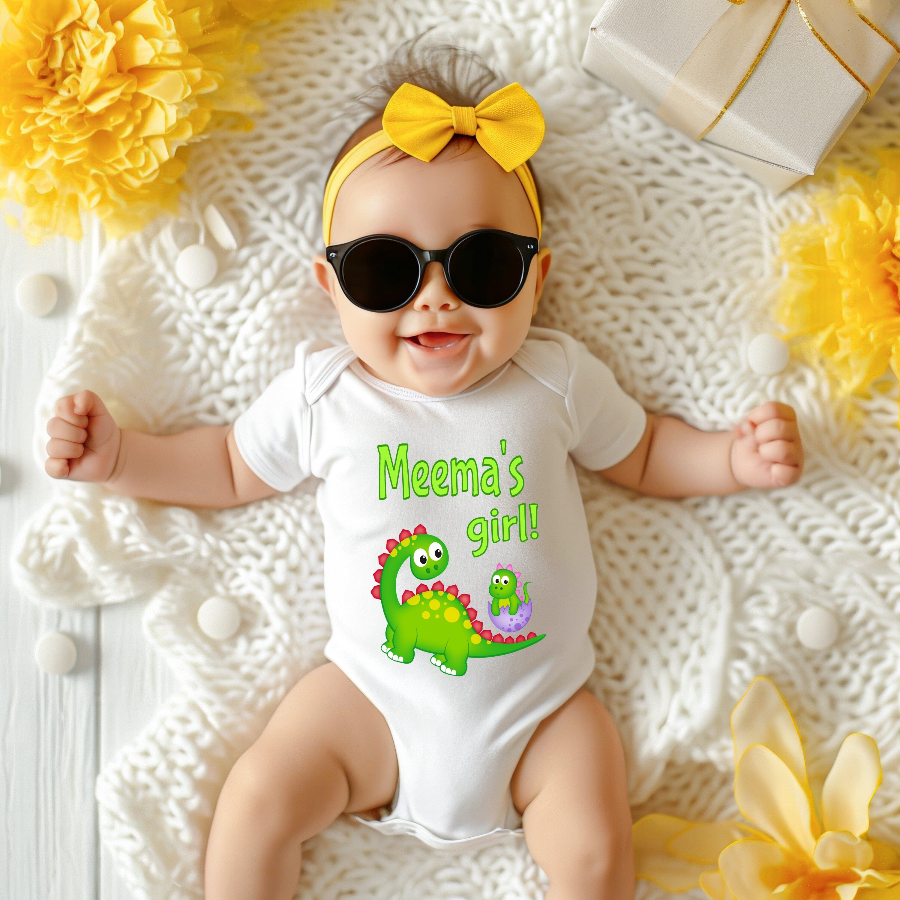 Meema's Girl Cute Grandma Name Dinosaur Baby Bodysuit, Tshirt or Toddler Shirt for a Yiddish Grandmother Gift or Pregnancy Reveal Announcement