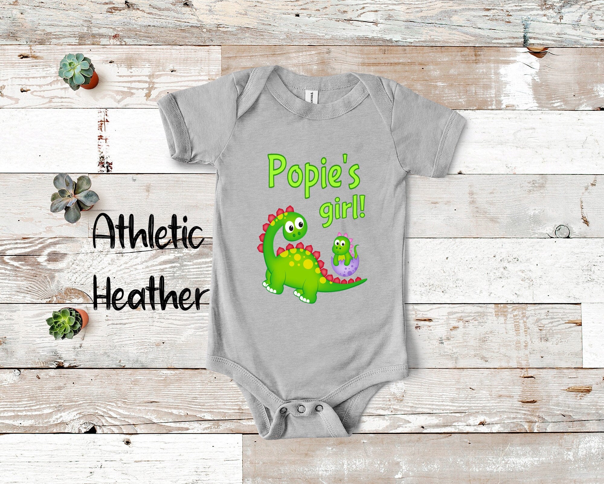 Popie's Girl Cute Grandpa Name Dinosaur Baby Bodysuit, Tshirt or Toddler Shirt for a Special Grandfather Gift or Pregnancy Reveal Announcement